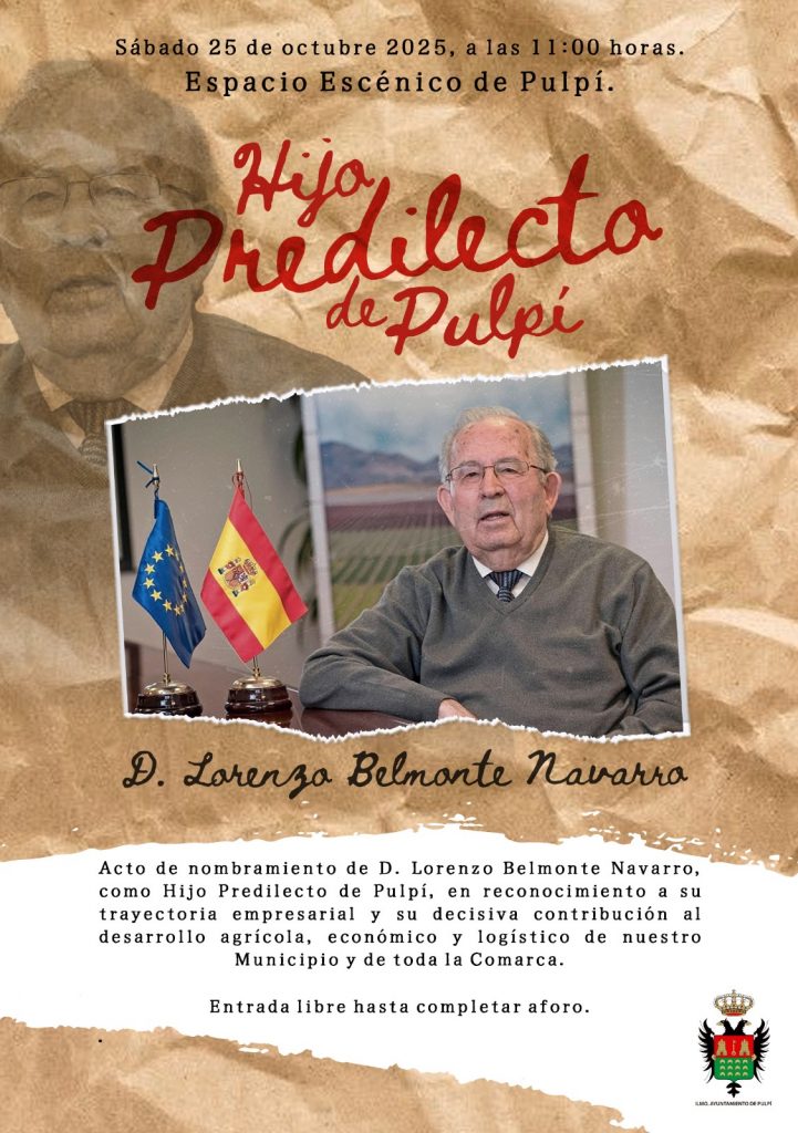 25 de octubre de 2025 11:00 Comprar Entradas Evento gratuito Obtener invitación ACTO DE NOMBRAMIENTO DE HIJO PREDILECTO DE PULPÍ Lugar: Espacio Escénico de Pulpí. Fecha y Hora: Sábado 25 de octubre de 2025, a las 11:00 horas. Acto solemne de nombramiento de D. Lorenzo Belmonte Navarro como Hijo Predilecto de Pulpí. Este reconocimiento se […]